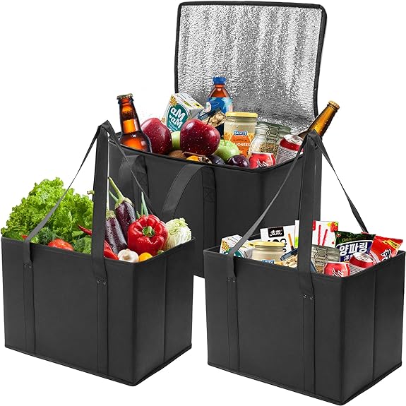 DAREKUKU 3 Pack Reusable Grocery Bags, Foldable Washable Insulated Shopping Bag For Groceries With Reinforced Bottom & Handle In Stock